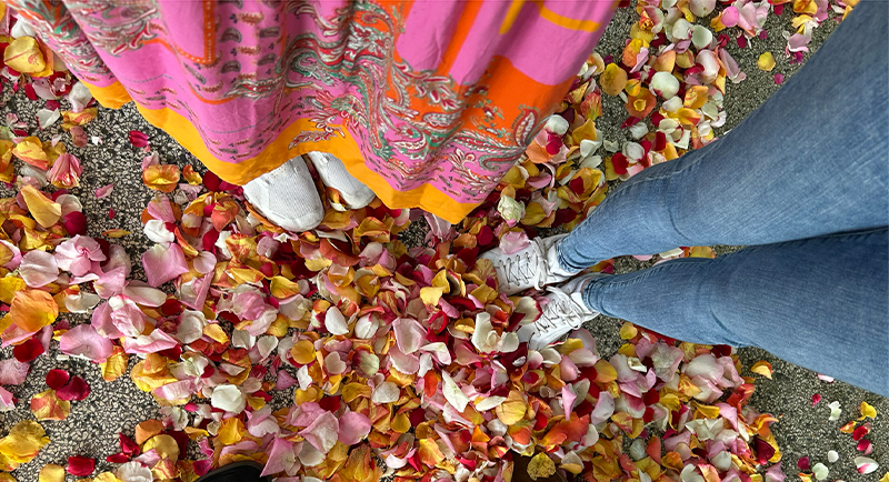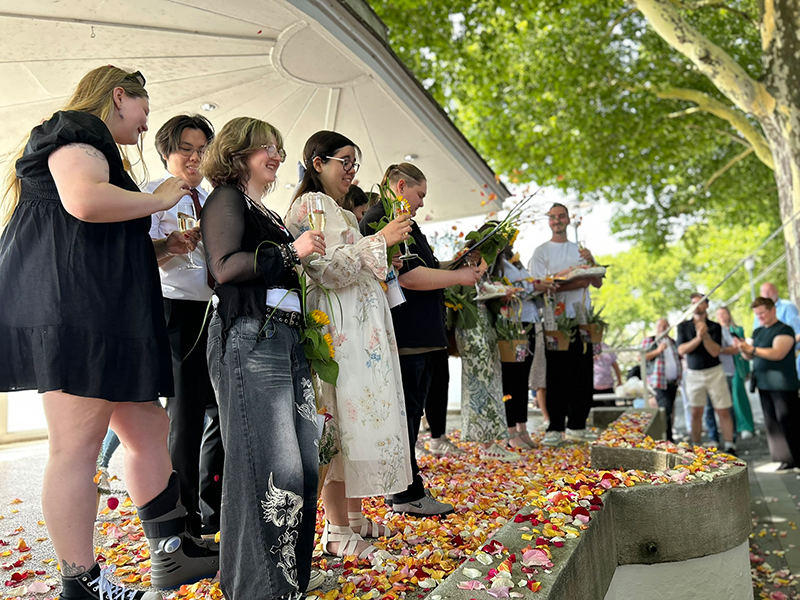 Blütentaufe – so heißt die Lossprechungsfeier in der Floristik und natürlich wird dieses Ritual auch im wörtlichen Sinne umgesetzt, wenn die Berufsschullehrerinnen Tausende von Rosenblättern auf die frisch ernannten Florist:innen regnen lassen.