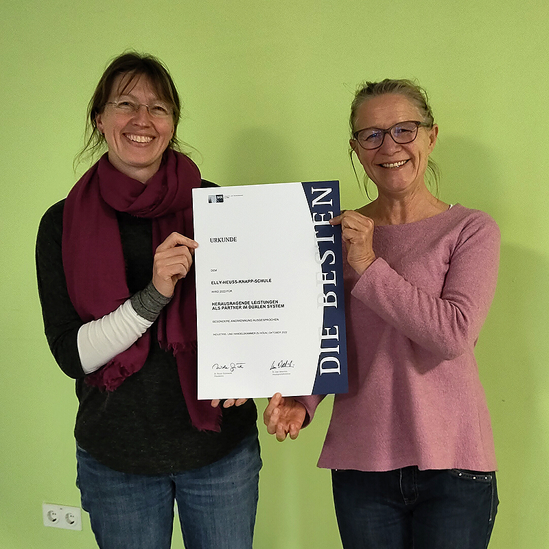 Für herausragende Leistungen als Partnerin im Dualen System wurde der Elly kürzlich besondere Anerkennung ausgesprochen. In Kooperation mit den Betrieben der IHK werden bei uns Tierpfleger:innen, Modenäher:innen und Florist:innen bestens ausgebildet.